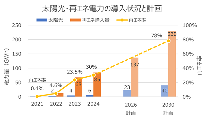 2030年までに40GWhの太陽光発電設備の導入を目標に、中期経営計画2026では30億円の設備投資を計画しています。