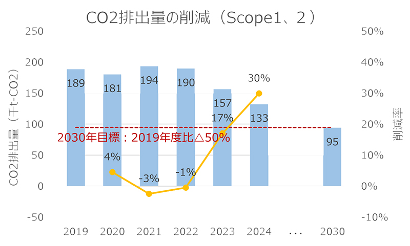 2024年度の排出量は、既存の省エネ施策を継続的に実施することと併せ、太陽光発電設備設置や再エネ電力購入を行ったことにより133千t-CO2(2019年度比▲30%)となりました。