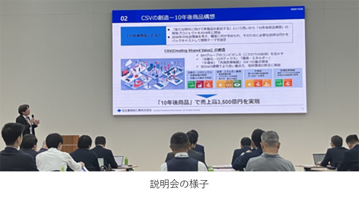 前半の工場見学、事業説明会は、当社の中期経営計画2026の進捗状況をご報告するとともに、2025年に完成したイノベーション拠点「技術研究・創発棟 Cs’‐Lab+(読み方:シーズラボ)」における研究開発中の技術紹介、ならびにメカトロニクス事業部、住友重機械イオンテクノロジー、住友重機械マリンエンジニアリングの事業戦略への理解を深めていただくことを目的として実施いたしました。